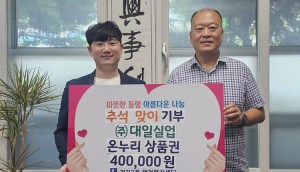 ㈜대일실업(대표 김진수)은 지난 3일, 추석을 맞아 장안구 정자3동에 온누리상품권 40만원을 기탁했다.김진수 대표는 “민족의 대명절인 추석을 맞아 관내 어려운 이웃 모두가 즐거운 연휴를 보내시기를 바라는 마음을 담았다. 가족과 이웃이 함께 온정을 나누고 행복한 명절이 되길 기원한다”고 전했다.최환주 정자3동장은 “어려운 이웃에 대한 깊은 관심과 나눔에 감사드리며, 기탁해주신 온누리상품권이 관내 취약계층에게 잘 전달될 수 있도록 하겠다”고 말했다. 게시일 : 2024-09-04, 글쓴이 : 김홍범 기자