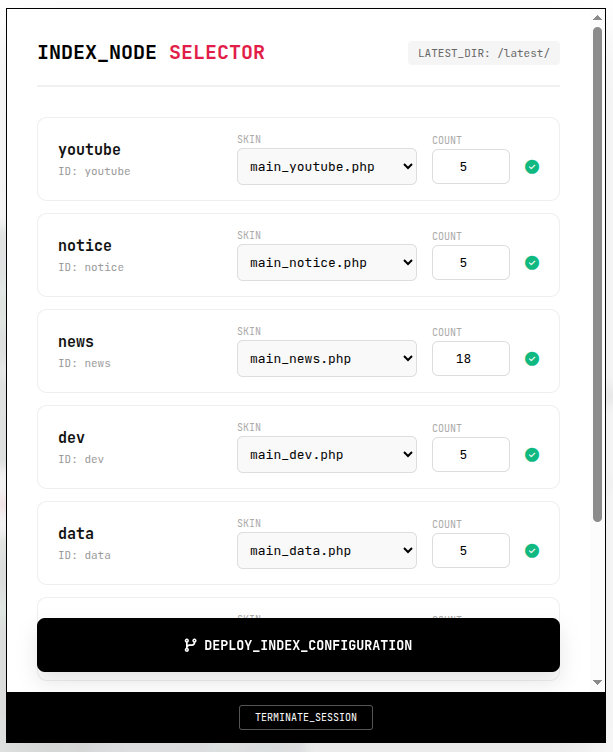 게시판을 생성하면 자동 생성되는 시스템 인덱스 최신글 스킨, 출력 숫자를 조정할 수 있다.